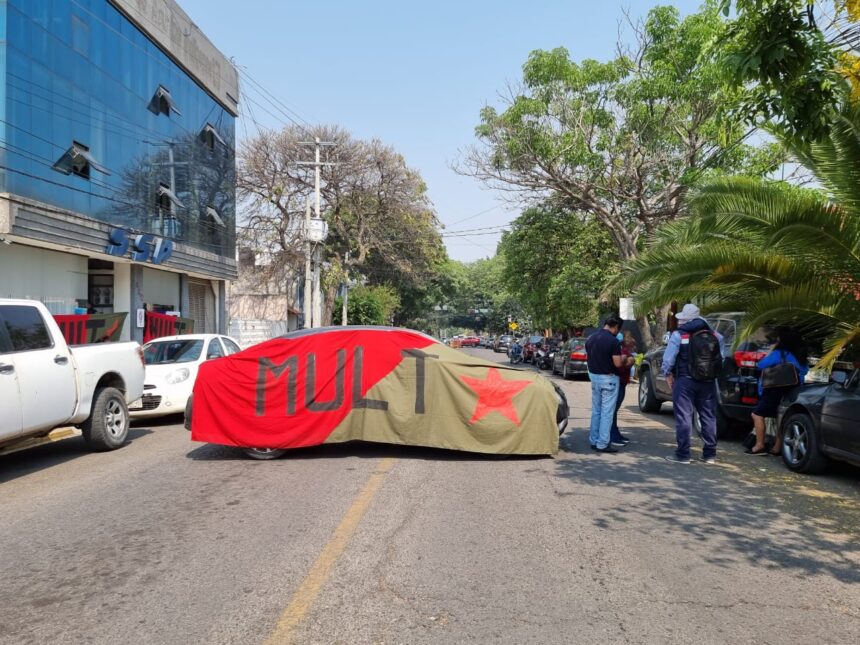 Al mando de Emelia Ortiz García, de la dirección Colectiva del Mult, bloquean también la calle de Belisario Domínguez, a la altura de la secretaria, porque elementos de la policía vial estatal retuvieron un automóvil cuando supuestamente regresaba a Putla Villa de Guerrero, Oaxaca.