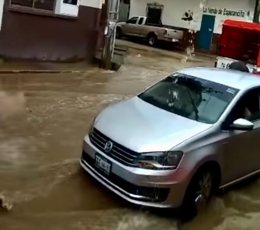 Oaxaca, México , 07 del septiembre del 2022.- Las fuertes lluvias que se han registrado en el estado de Oaxaca, han dejado diversas afectaciones en algunos municipios, como en Miahuatlán de Porfirio Díaz, en donde calles céntricas se inundaron por la abundante lluvia, así como afectación a unidades de motor.