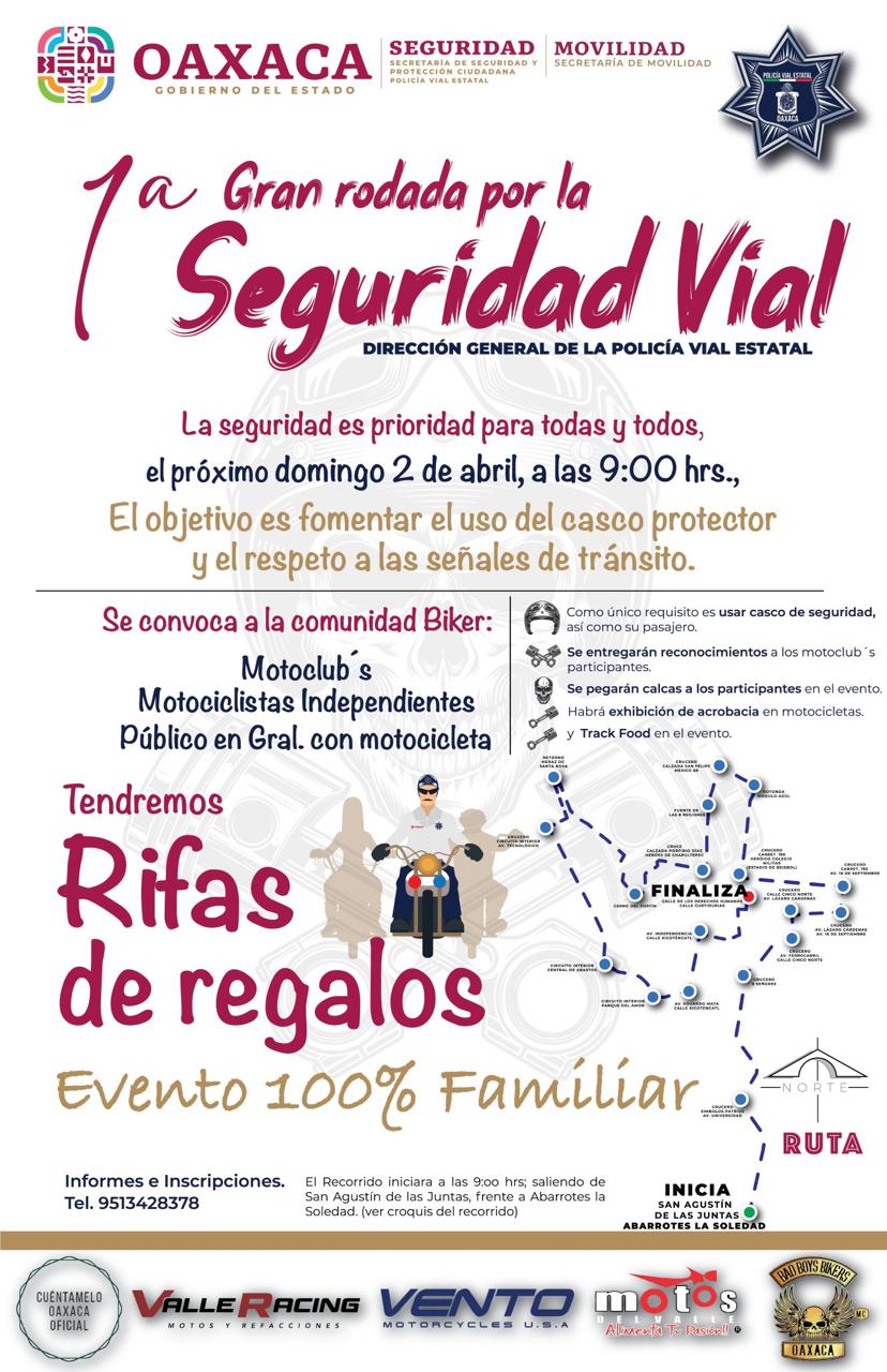 La 1ª Gran Rodada por la Seguridad Vial se realizará el domingo 2 de abril a las 9:00 horas, teniendo como punto de salida la explanada de Abarrotes La Soledad, ubicada en San Agustín de las Juntas, para finalizar en la calle de Los Derechos Humanos, con el único requisito de portar el casco de seguridad.
