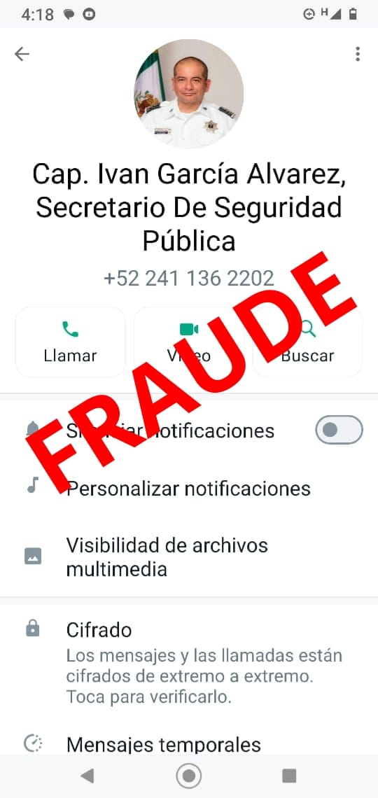 Oaxaca de Juárez, Oax. 16 de diciembre de 2023.- Ante las recientes denuncias sobre solicitudes, presuntamente del titular de la Secretaría de Seguridad y Protección Ciudadana (SSPC) Iván García Álvarez, en las que se exigen fuertes sumas de dinero por concepto de multas, esta institución exhorta a la población a no dejarse engañar por estas prácticas fraudulentas cometidas a través de servicios de mensajería instantánea con el número de celular 241 136 2202.