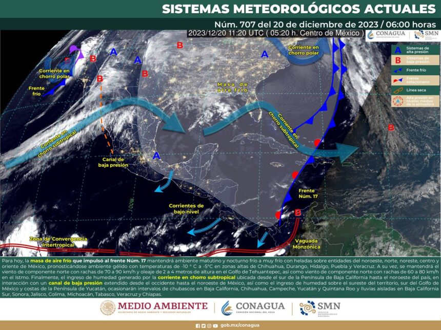 Oaxaca de Juárez, Oax. 20 de diciembre del 2023.- La Coordinación Estatal de Protección Civil y Gestión de Riesgos (CEPCyGR) informa que la masa de aire fría y seca generada por un sistema de alta presión, se extiende sobre el oriente y sureste de México hasta el norte de Centroamérica, esto de acuerdo con la información proporcionada por la Comisión Nacional del Agua (Conagua).