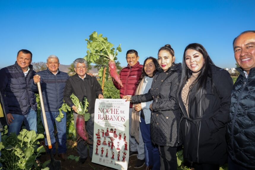 “Nos encontramos aquí para realizar esta tradicional cosecha, con la cual las y los hortelanos y personas artesanas podrán tener las plantas e insumos necesarios para expresar su creatividad e imaginación con las extraordinarias figuras de rábano que son muestra consumada del talento de nuestro pueblo”, comentó.