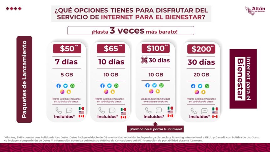 Los cuatro paquetes de lanzamiento, tres veces más baratos que el resto de empresas, incluyen redes sociales y minutos de llamadas en México, Estados Unidos y Canadá, con los siguientes costos: 50 pesos para siete días con cinco gigabytes (GB); 65 pesos para 10 días con 10 GB; 100 pesos para 15 días con 10 GB o 30 días en caso de portar su número, y 200 pesos por 30 días y 20 GB.