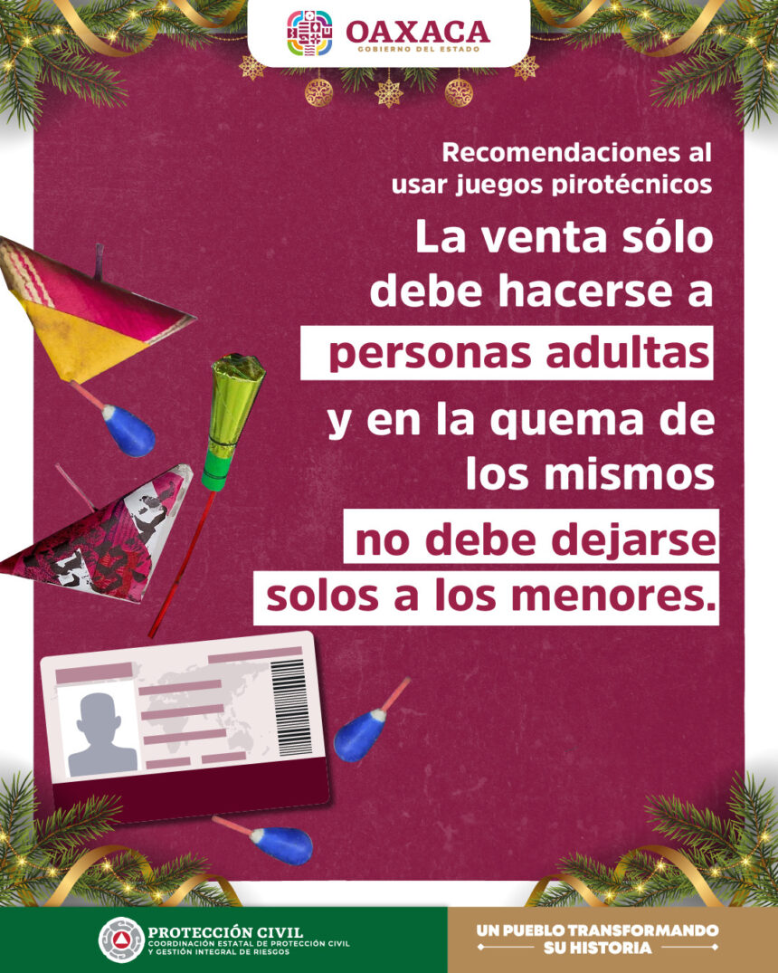 Oaxaca de Juárez, Oax., 1 de diciembre de 2023.- Con el objetivo de salvaguardar la vida y el patrimonio de la sociedad, la Coordinación Estatal de Protección Civil y Gestión de Riesgos (CEPCyGR) emite las siguientes recomendaciones preventivas ante el aumento de la comercialización y manipulación de juegos pirotécnicos durante las fiestas decembrinas.