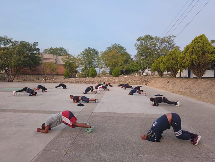 Durante la quinta semana de instrucción, las y los cursantes realizaron ejercicios de fortalecimiento de brazos, piernas y abdomen, así como trote o carrera, como parte del Acondicionamiento Físico; autoaplicación de inyección intramuscular en la asignación de Medicina Táctica; calistenia para natación y técnicas de nado de crol; al igual que despeje de casa habitación y técnicas de despeje a barricadas en Combate Cercano en Interiores.