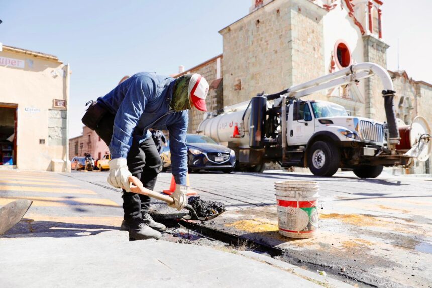 Oaxaca de Juárez, Oax. 2 de enero de 2024.- Personal del Departamento de Alcantarillado del Sistema Operador de los Servicios de Agua Potable y Alcantarillado (Soapa), realizó el desazolve de las rejillas pluviales ubicadas en la avenida Morelos, frente a la Plaza de la Danza, ante el colapso de aguas negras.