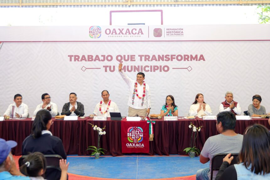 Reunidos en la cancha deportiva de Santa María Jaltianguis, y acompañado de la Presidenta Honoraria del Sistema Estatal para el Desarrollo Integral de la Familia (DIF) Oaxaca, Irma Bolaños Quijano, el Mandatario estatal señaló que se canalizan 5 millones 246 mil pesos a través de la estrategia Trabajo que Transforma tu Municipio para atender los requerimientos sociales de esta localidad.