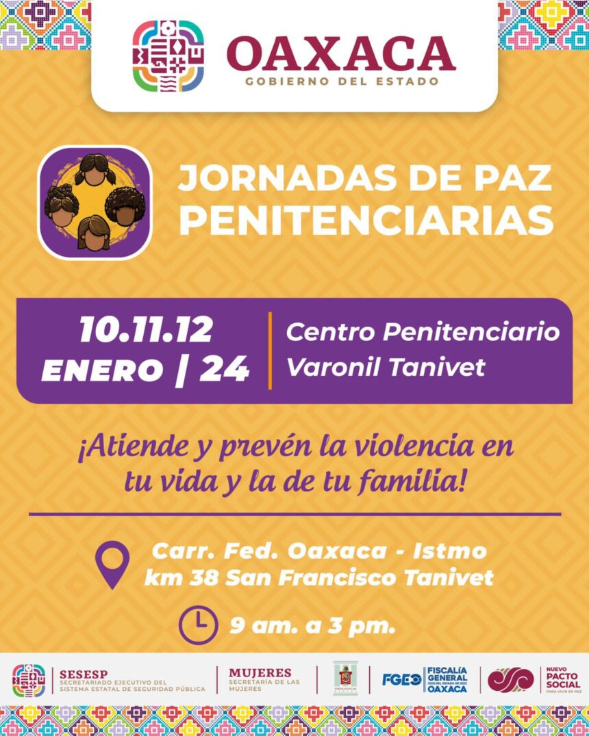 Con esta acción más de 25 instituciones responsables de la paz, justicia, bienestar y gobernabilidad, acercarán sus servicios y asesoría a las PPL del Centro Penitenciario Varonil de Tanivet, los próximos 10, 11 y 12 de enero; así como al Centro Penitenciario Varonil de la Villa de Etla, el día 16 de enero.