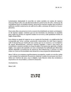 Derivado de la situación que se dio con una persona que asistió a Muss Café, la empresa realiza la siguiente aclaración mediante un comunicado, el cual reproducimos de manera íntegra.