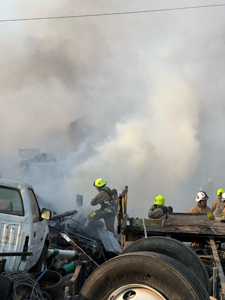 Oaxaca de Juárez, Oax., 1 de abril de 2024.- Integrantes del Heroico Cuerpo de Bomberos de Oaxaca (HCBO) dependiente de la Secretaría de Seguridad y Protección Ciudadana (SSPC) atiende un incendio generado al interior de un deshuesadero en la colonia Exhacienda Candiani, en Oaxaca de Juárez.