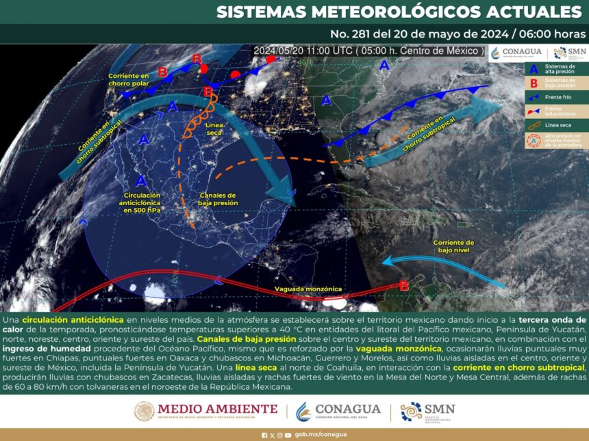 Por otro lado, la vaguada monzónica impulsará ligera humedad hacia el interior del estado dejando algunas lluvias con tormentas aisladas por la tarde.