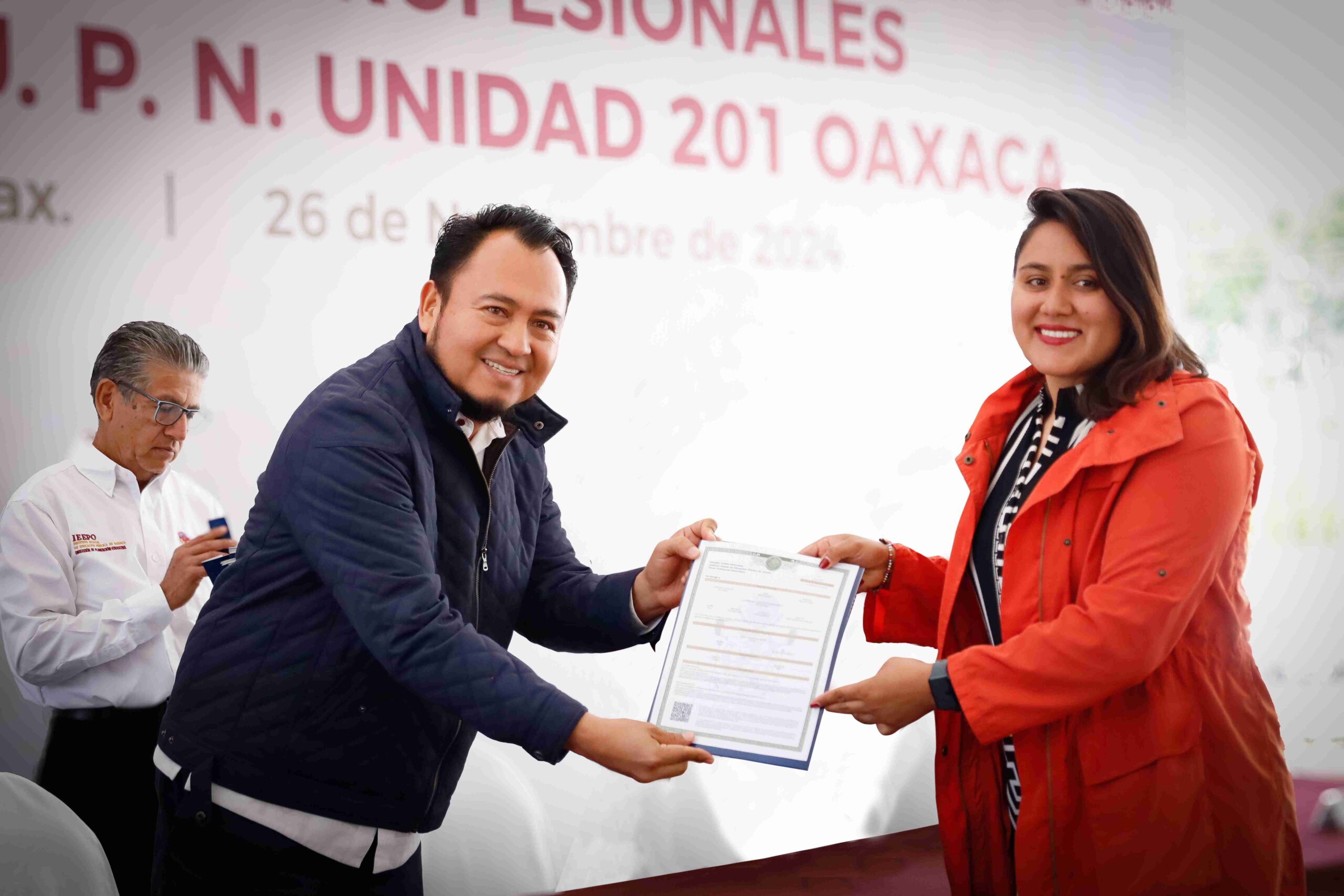 En la entrega realizada en las instalaciones de la UPN Unidad 201, acompañado del director de Planeación Educativa, Florencio de la Cruz Valdivieso y del director del plantel, Andrés Arturo Cruz Hernández, el Director General del IEEPO felicitó a las y los profesionistas por este esfuerzo.