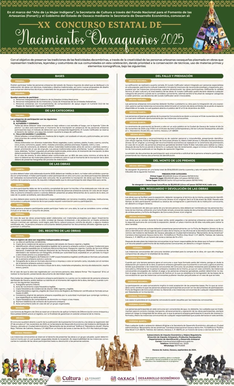 Tlalixtac de Cabrera, Oax. 3 de octubre de 2025.- Con el propósito de preservar las tradiciones decembrinas y fomentar la creatividad de las y los artesanos oaxaqueños, la Secretaría de Desarrollo Económico (Sedeco) convoca a participar en el XX Concurso Estatal de Nacimientos Oaxaqueños 2025.