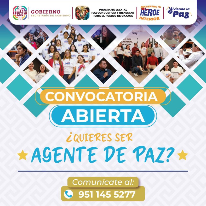 Oaxaca de Juárez, Oax. 9 de octubre de 2025.- La Secretaría de Gobierno del Estado de Oaxaca (Sego) lanza la segunda convocatoria del programa “Agentes de Paz”, dirigida a las juventudes oaxaqueñas comprometidas con la transformación social y la construcción de entornos más armónicos.