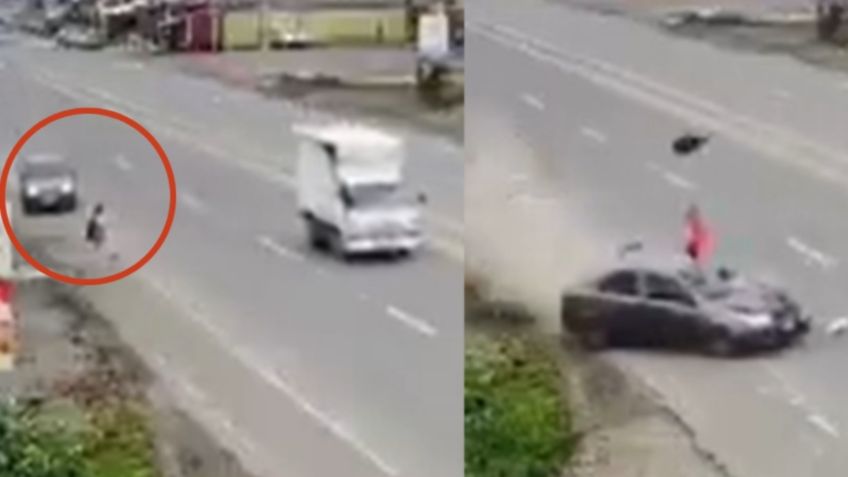 Por su parte, el vehículo perdió el control y casi da una vuelta completa en la carretera; su cofre quedó completamente destrozado. En el video se observa cómo un camión de pasajeros que circulaba junto a ellos logró esquivar a la mujer y al coche; ahí termina la grabación.