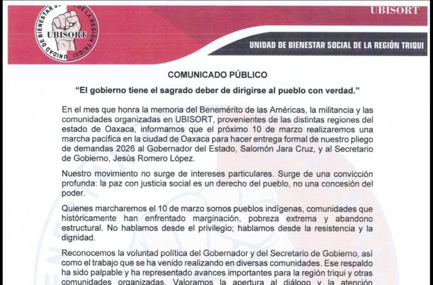 En el mes que honra la memoria del Benemérito de las Américas, la militancia y las comunidades organizadas en UBISORT, provenientes de las distintas regiones del estado de Oaxaca, informamos que el próximo 10 de marzo realizaremos una