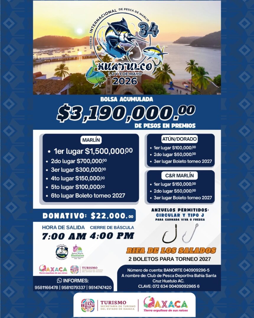 📣 La Secretaría de Turismo (Sectur Oaxaca) invita a participar y disfrutar del 34º Torneo Internacional de Pesca de Marlín, que se llevará a cabo del 1 al 3 de mayo en Bahías de Huatulco.