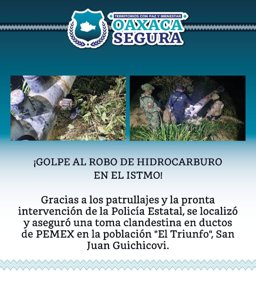 Oaxaca de Juárez, Oax. 17 de abril de 2026- Como resultado de las acciones coordinadas de vigilancia y prevención en el Istmo de Tehuantepec, la Secretaría de Seguridad y Protección Ciudadana (SSPC) coadyuvó en la localización de una toma clandestina de hidrocarburo en inmediaciones de la población de El Triunfo, en San Juan Guichicovi.