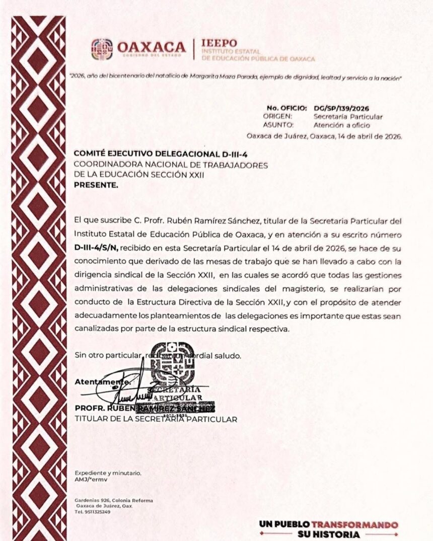 Mediante el oficio DG/SP/139/2026, firmado por el titular de la Secretaría Particular, Rubén Ramírez Sánchez, se informó que, derivado de las mesas de trabajo sostenidas con la dirigencia sindical, se acordó que todas las gestiones administrativas de las delegaciones del magisterio deberán realizarse a través de la estructura directiva de la Sección 22.