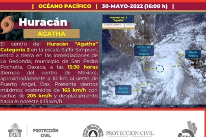 Huracán «Agatha» Categoría 2 entró a tierra a las 15:30 horas en las inmediaciones de La Redonda, San Pedro Pochutla